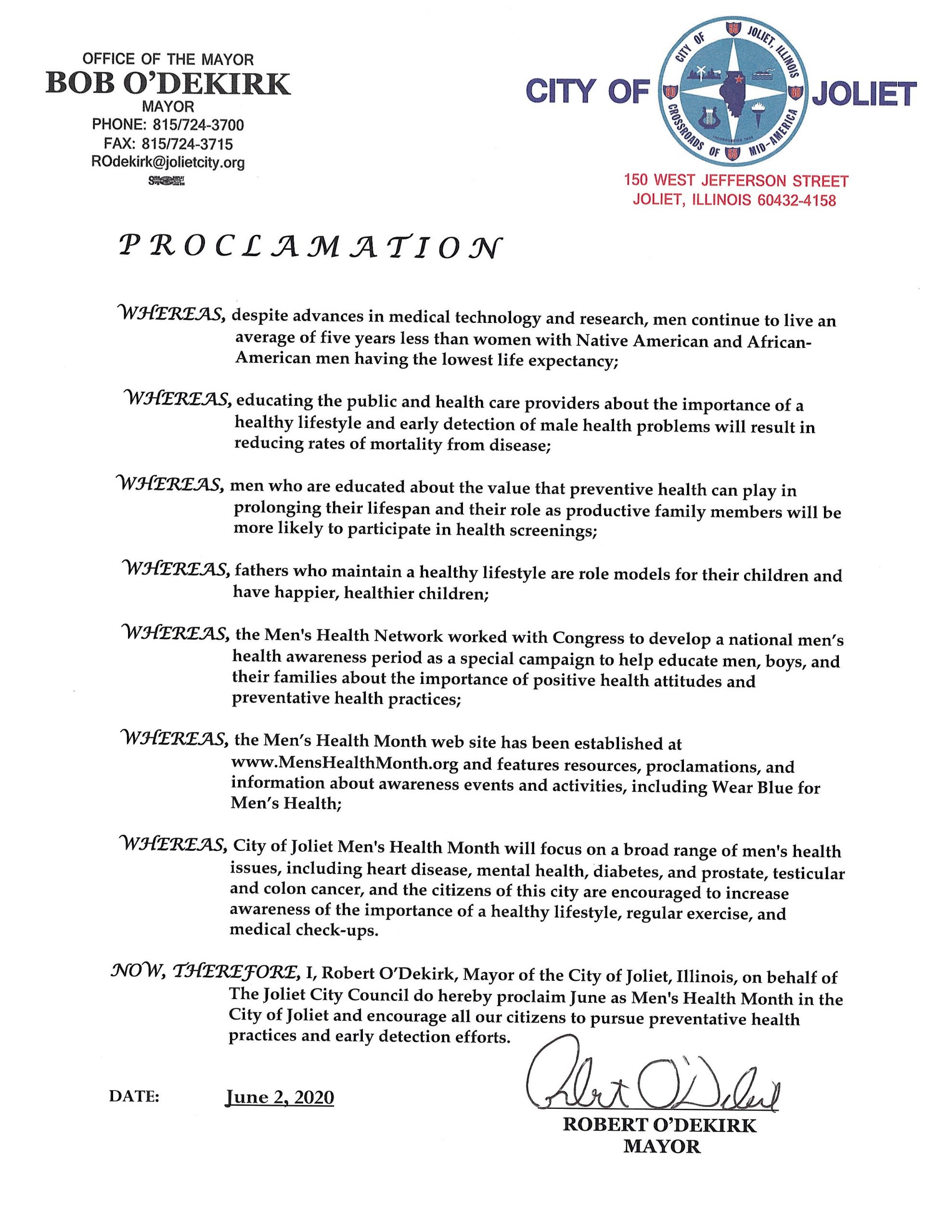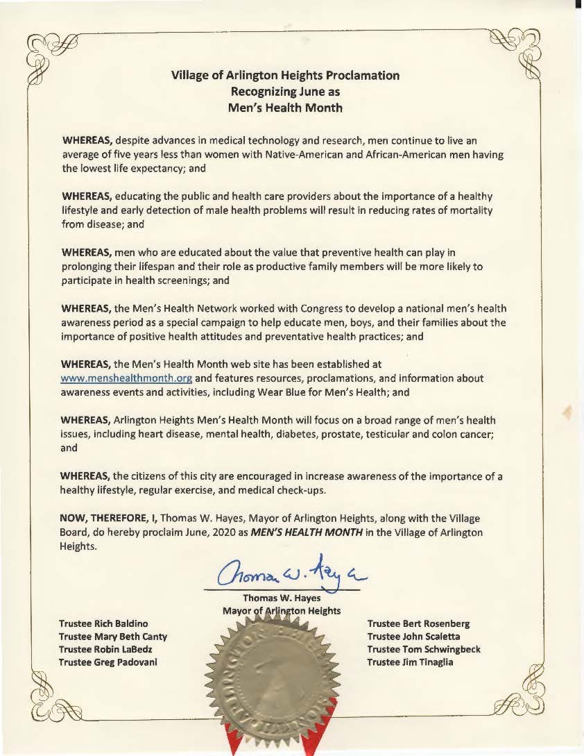 The state of Illinois, as well as the cities of Arlington Heights and Joliet, have issued proclamations celebrating men’s health and fatherhood in June, helping educate men, boys, and their families about disease prevention, timely screenings, healthy lifestyles, and positive family relationships.