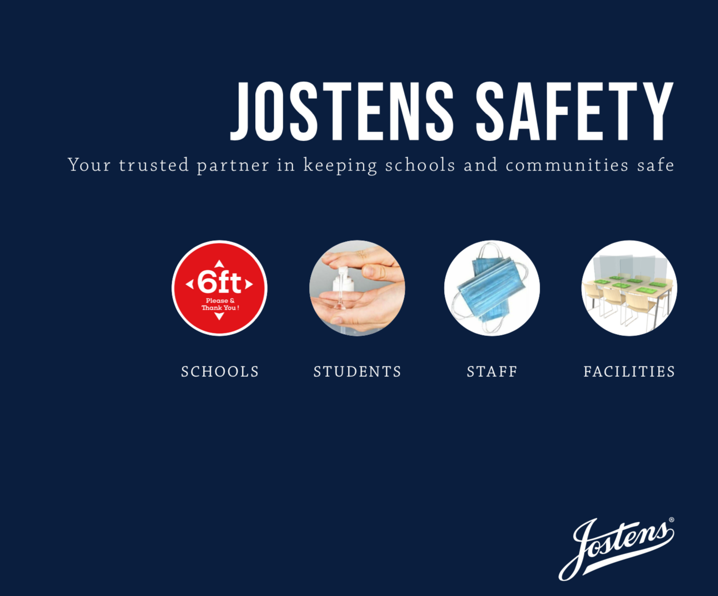 Jostens Safety products include personal protection kits of hand sanitizer, facemasks, thermometers, cleaning wipes, and surface disinfectant, as well environmental signage, social distance floor graphics, and protective barriers for classrooms and cafeterias. The limited supply of products are available to all schools in the United States through the Jostens Safety website at safety.jostens.com.