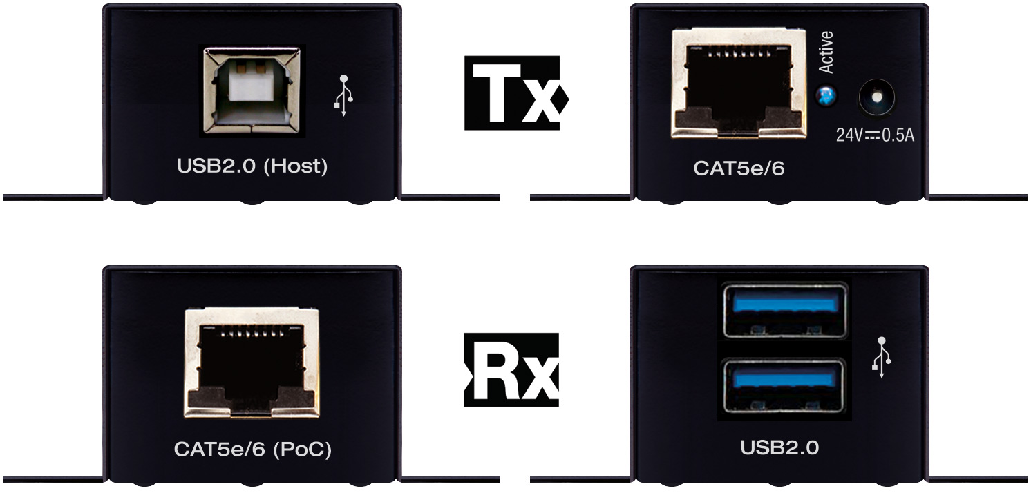 The extender kit is backward compatible supporting USB versions 1.1 through 2.0 with USB signal extension up to 50m (164ft) via single CAT5e/6 cable. Only the transmitter needs a power connection using Power over CAT (PoC) with which the receiver is powered by the transmitter. Additionally, with USB device-powering the receiver unit may provide 5V 500mA power to a connected device.