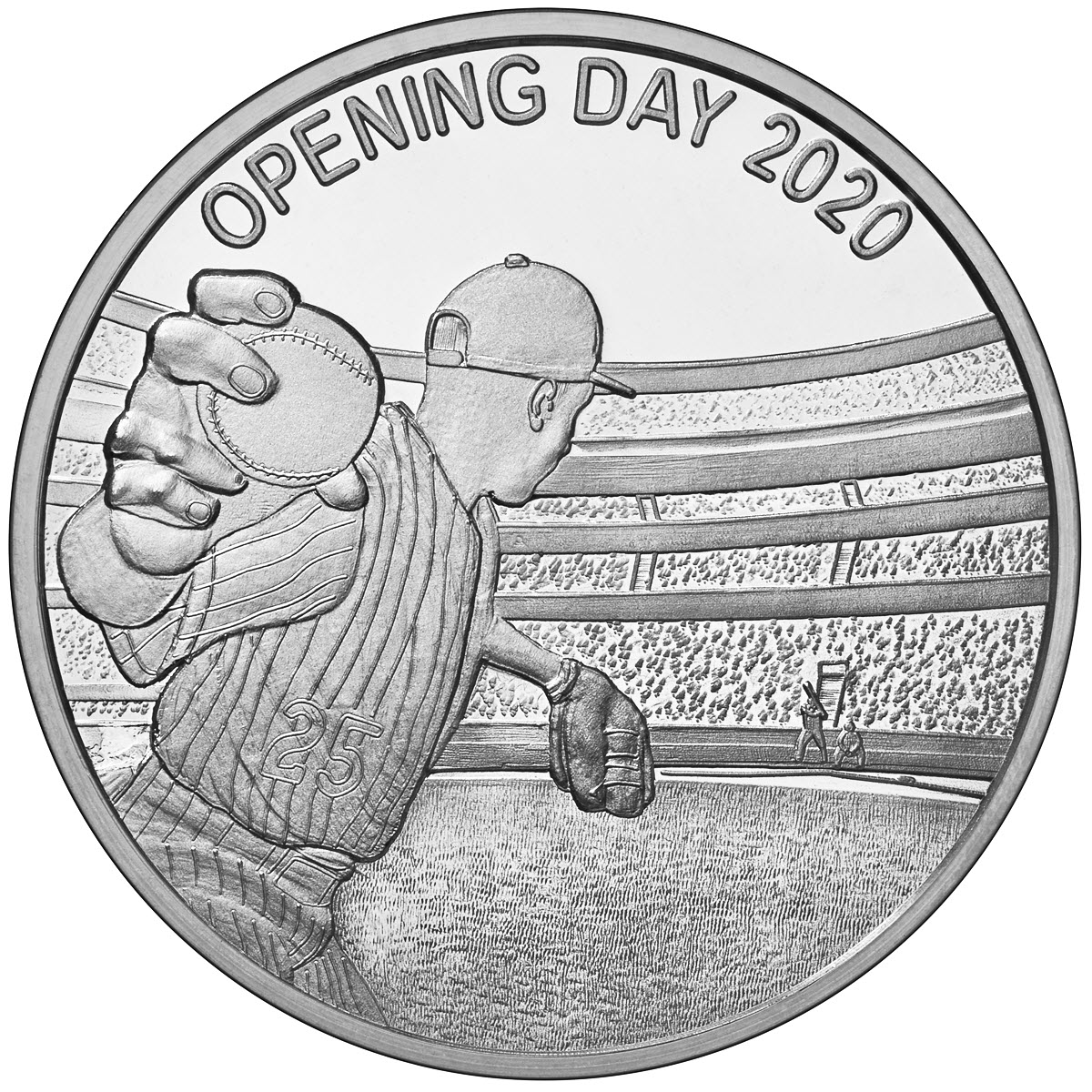 Here at Osborne Mint we too kept the faith and crafted this .999 fine silver collectible round to memorialize the July 23rd or 24th start of the 2020 Major League Baseball season. We were so certain that baseball would return we designed it and began manufacturing this gorgeous piece months prior to the announcement. The face of the round features one of the most iconic scenes in baseball, the first pitch – be it a ball or a strike - it signals the start of the game. Observing the obverse side of the round you can see the split finger fastball ready to be served up to the lefty at the plate. The pitcher is adorned in pinstripes with remarkable engraving depth and wearing the number 25. As a nod to previous opening days the stands are full from the VIP section behind the plate to the cheap-seats in the bleachers and top level. The reverse of this collectible identifies the significance of America’s favorite pastime to our country with the presentation of the American flag, the wings of an eagle and a ribbon inscribed with USA. This one troy ounce of .999 fine silver is guaranteed for weight and purity. The reverse is also minted with the official Osborne Mint insignia (O/M) assuring the quality and craftsmanship for which Osborne Mint is famous. The collectible is enhanced even further with the addition of reeded edges that add character to the round by replicating, in a sense, the stitches of the baseball. All totaled this Opening Day 2020 round knocks it out of the park!