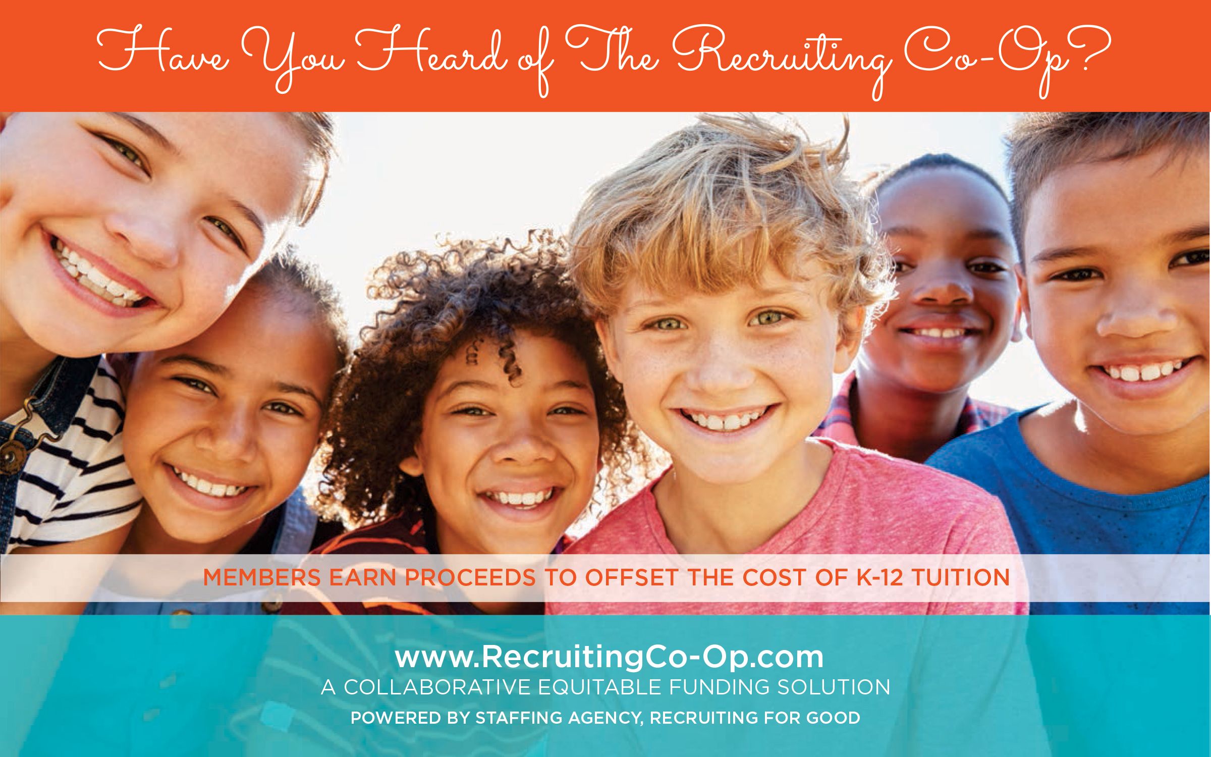 Staffing Agency, Recruiting for Good launches Co-Op to reward referrals with funding for K-12 tuition (private/religious), health food, and health insurance.