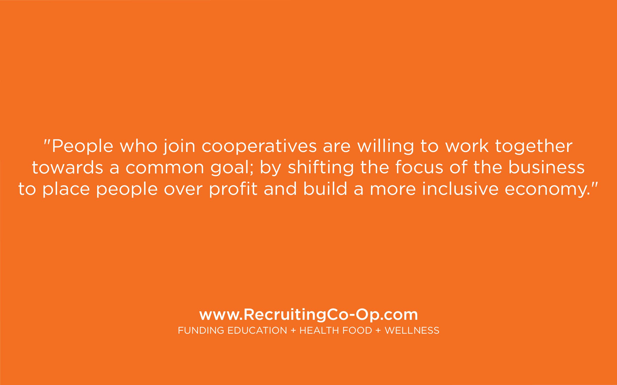 According to Recruiting Co-Op, Founder, Carlos Cymerman, "People who join cooperatives are willing to work together towards a common goal; by shifting the focus of the business to place people over profit and build a more inclusive economy...Our purpose driven mission is to improve the quality of life for Co-Op members, and their family."