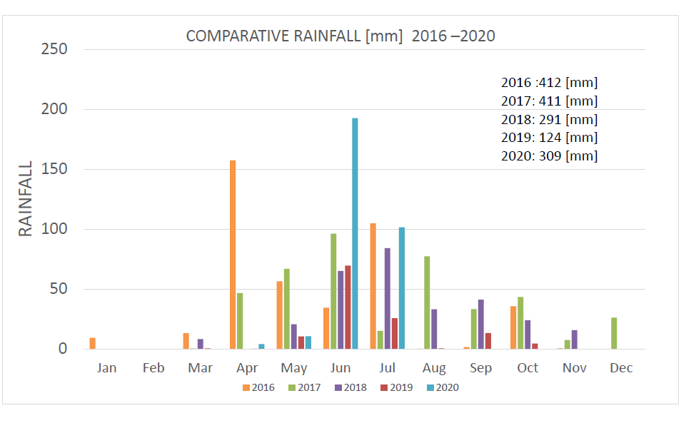 The following table was updated to July 15, 2020 and shows cumulative rainfall of 309 mm as of that date, essentially 75% of normal annual rainfall in the region.