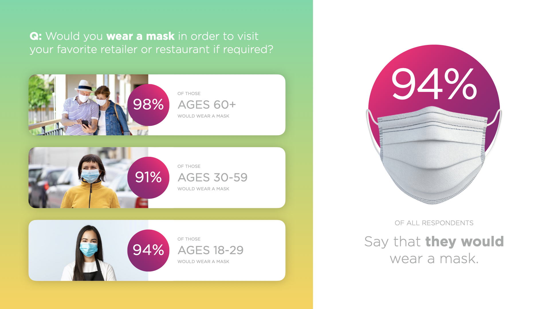 - Consumers are willing to wear a mask. 94% of all respondents surveyed indicated that they would be willing to wear a mask, if required, to visit their favorite retailer or restaurant.