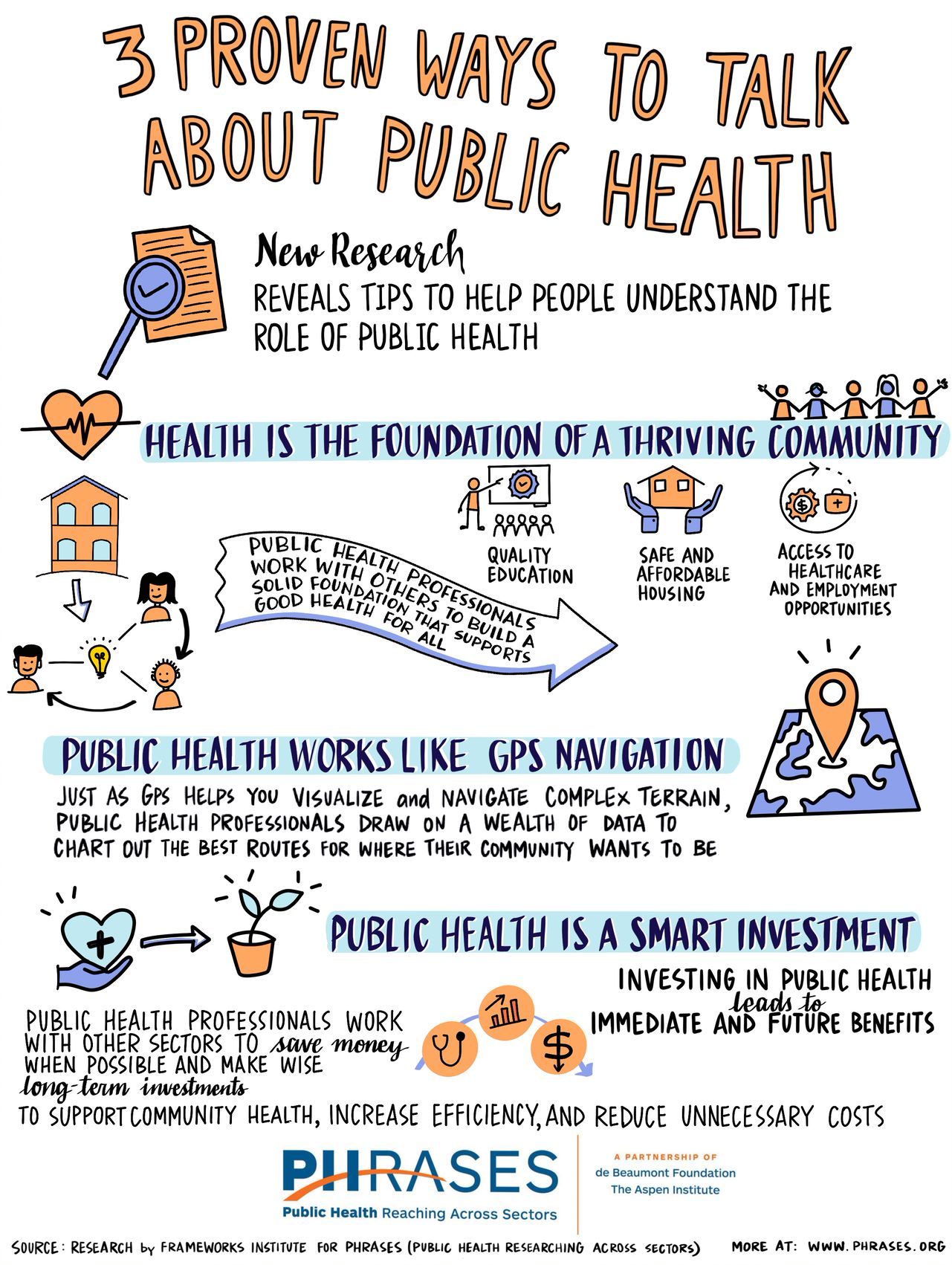 Through the PHRASES project (Public Health Reaching Across Sectors), the de Beaumont Foundation and the Aspen Institute's Health, Medicine and Society Program worked with the FrameWorks Institute and Hattaway Communications to understand perceptions of public health professionals and their work among leaders in business, education, housing, and health systems and to develop tools to improve communication with all audiences. Research included in-depth interviews and focus groups with leaders in these and other fields, as well as community members.