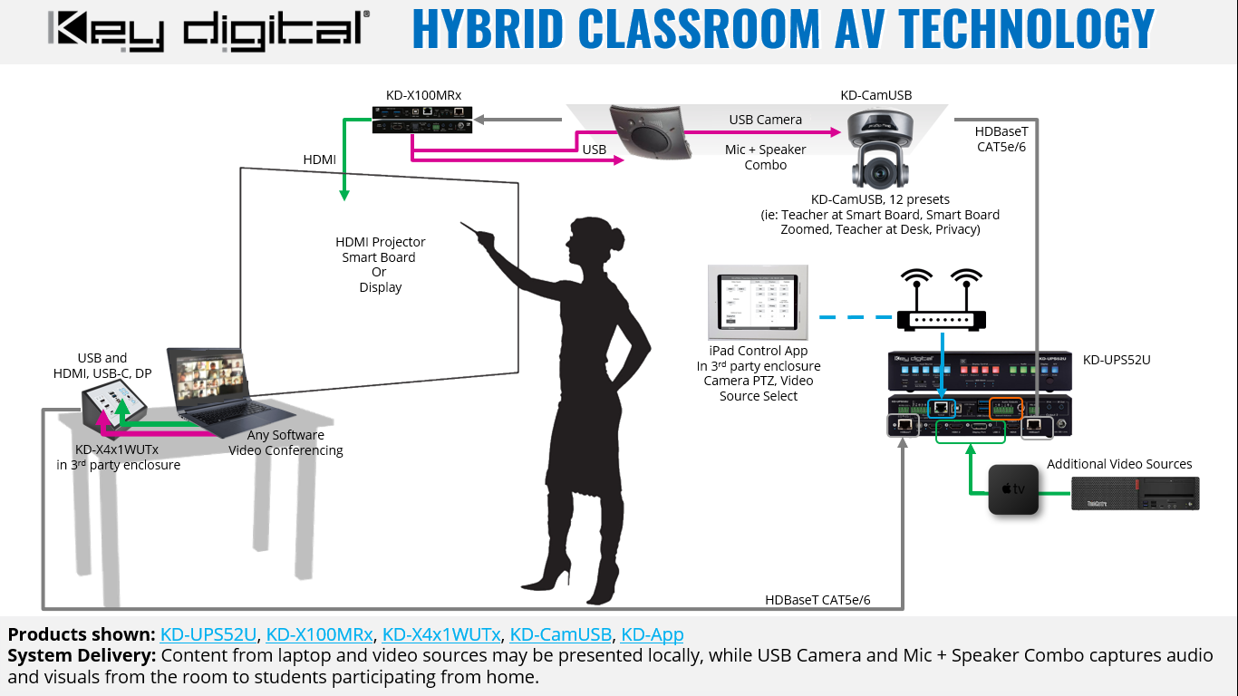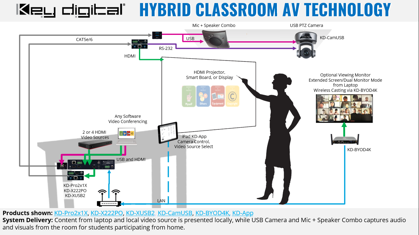 “Our presentation solutions product family has really been ready since day-one to accommodate the transition from in-person courses to online. With the USB signal routing layer of our systems, and our professional USB webcam with PTZ control features, teachers can freely move about their classrooms as they would in a room full of students, and our camera can adjust positioning to capture the day’s lessons. Our systems are perfectly set up for either localized presentation or via popular conferencing software like Zoom, Google Classroom, and more, again making our system perfect for distance-learning, hybrid classrooms, or traditional in-person settings,” said Jonathon Ferry, National Training Manager for Key Digital.