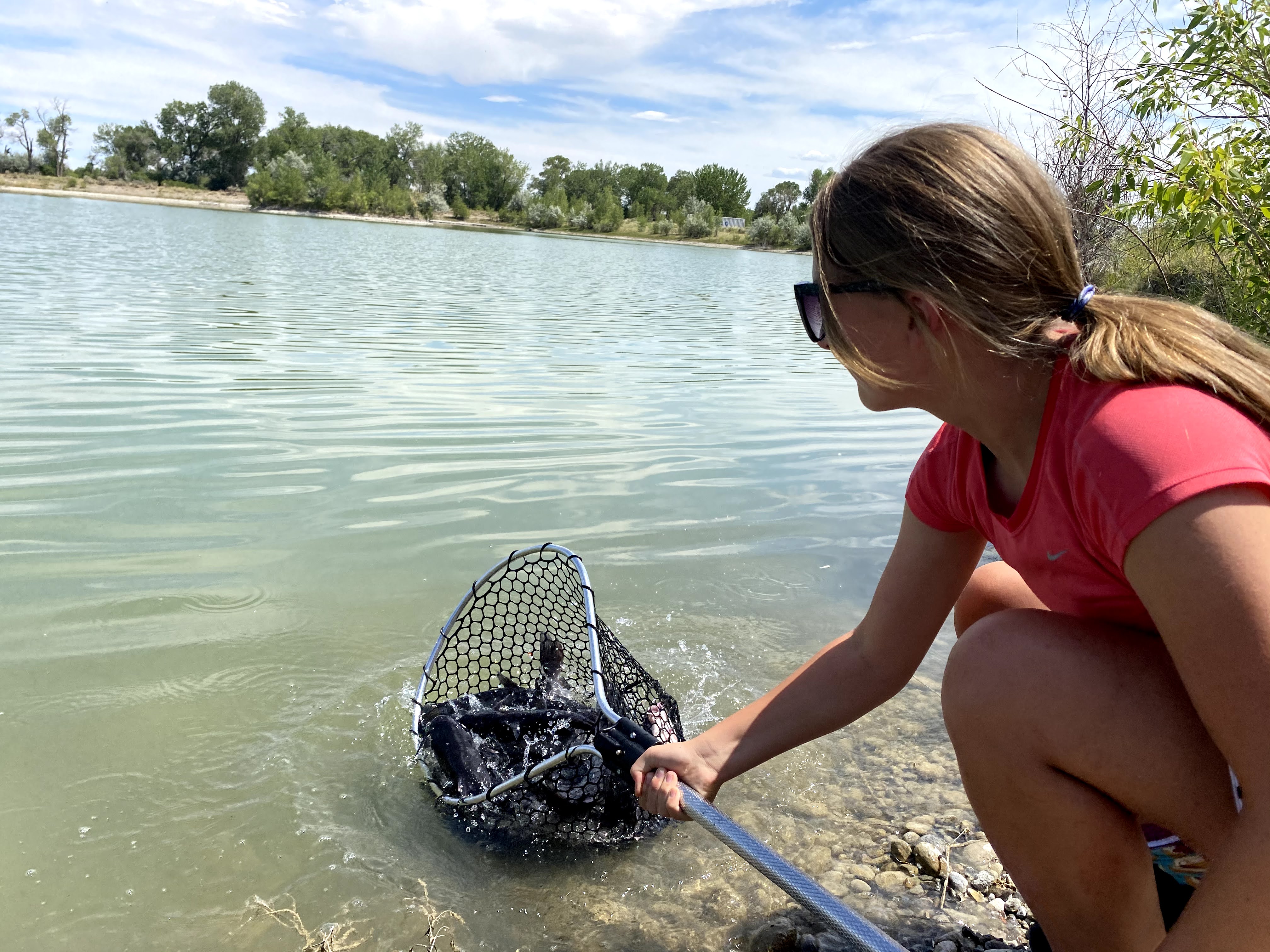 The catfish come from the Wyoming Women’s Center’s in-house aquaculture program. At Big Bend ponds, the fish were scooped from the tank on the truck and carried in net-fulls to each pond to be stocked. A few Game and Fish employees were on site and were assisted by a local youth volunteer.