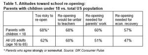 NEW YORK, NY, UNITED STATES, August 4, 2020 /EINPresswire.com/ -- The COVID-19 virus is forcing US adults to confront a variety of no-win choices – with no population more profoundly affected than parents. As many schools nationwide are gearing up to re-open in the Fall, parents find themselves deeply ambivalent – knowing they need to get back to the workplace but worried about the infection risks their kids will face in classrooms or on playgrounds.In GfK research conducted last week, 68% of US parents with children under age 18 said they agree strongly or somewhat that it would be too risky to re-open schools this Fall – compared to 62% of the general population. (See Table 1.) The same proportion of parents – and 60% of all US adults – also said that re-opening would be unfair to teachers.