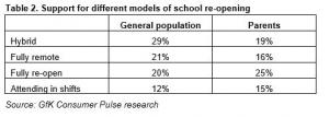 In addition, while all US respondents were more likely to favor a hybrid (in-person plus online) model of reopening, parents preferred a full return to on-site schooling. (See Table 2.)