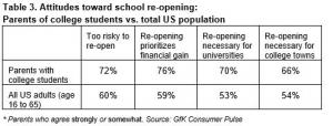 But these same parents also were more likely to recognize that re-opening is critical to the financial well-being of universities (70%, versus 53% of the general population) and college towns (66%, versus 54%).