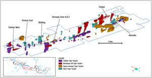 Mira used drilling and mapping databases, geochemical samples, Induced Polarization (IP), Electromagnetic (EM), magnetic and gravity datasets and other public data, to provide a regional scale targeting model of the Alpha Property to assist with resource expansion and regional exploration. A total of 661,760 metres in 2,400 drill holes, over 2,000 surface assays, 160,000 assays for gold and base metals plus 25,000 multi-element assays, 400 line kilometres of IP, 5,500 line kilometres of Mag and over 700 line kilometres of EM were used.