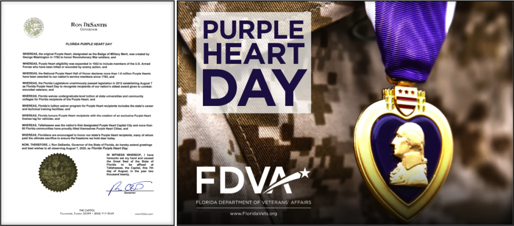 The Florida Legislature unanimously passed legislation in 2012 establishing Aug. 7 as Florida Purple Heart Day to recognize recipients of our nation’s oldest award given to combat-wounded veterans.