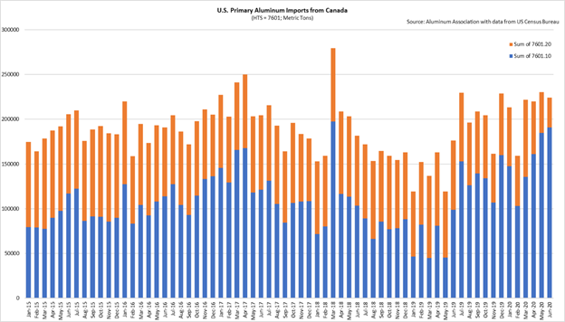 ARLINGTON, VA, Aug. 06, 2020 (GLOBE NEWSWIRE) -- Data released yesterday by the U.S. Census Bureau showed that overall imports of primary aluminum from Canada (7601) into the United States declined by about 2.6 percent from May to June. Primary aluminum import volumes from Canada for the first 6 months of 2020 were nearly 5 percent lower than same period in 2017.
