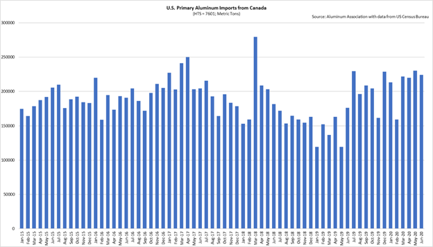 “This latest data release is consistent with our position all along – claims of a ‘surge’ of primary aluminum imports from Canada are simply not accurate. It is disappointing that the few companies who stand to benefit from reinstated Section 232 aluminum tariffs on Canada have cherry-picked government data and omitted important context to build their case,” said Tom Dobbins, president & CEO of the Aluminum Association. “Especially now, the U.S. should be focused on getting the manufacturing economy going again in the region – not picking battles with USMCA trading partners. With U.S. aluminum demand down almost 25 percent so far in 2020 – the first decline in nearly a decade – the industry can simply not afford more shocks to the market.”