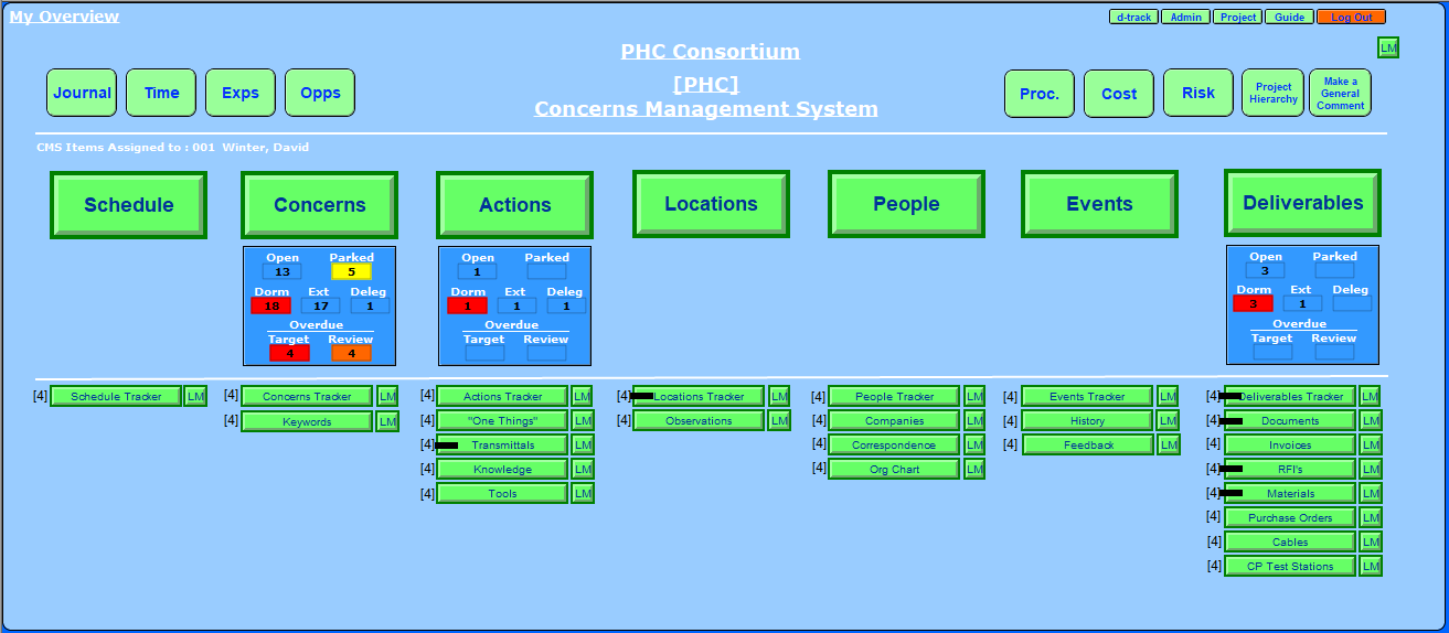 Project Health Control resolves communications issues by keeping data organised using the seven PHC lists, the most prominent being Concerns, Actions and Deliverables. Three kinds of human interface are provided in a PHC system for access to a project's PHC data.