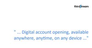 thirdstream, headquartered in Lethbridge, Alberta, provides digital account opening solutions, online and in-branch, to over forty clients. From identity verification to account funding, thirdstream’s solution set supports consumer acquisition, business onboarding, and unsecured retail lending and credit card adjudication. The platform is cloud-deployed, designed for retail and business consumers seeking out financial institutions, and for financial institutions targeting consumers anywhere, anytime, from any device. To learn more, visit thirdstream.ca.