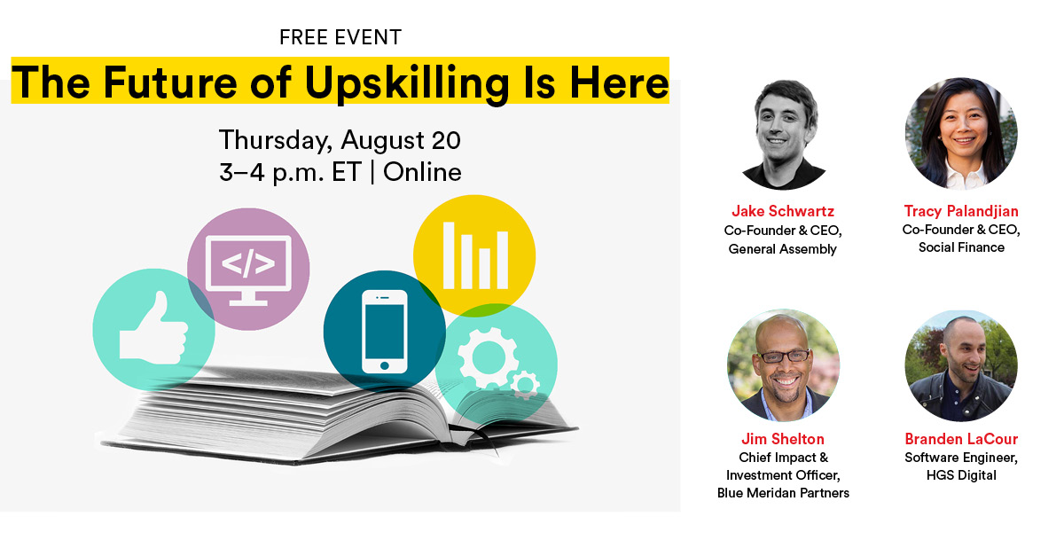 Join Jim Shelton, chief investment and impact officer at Blue Meridian Partners, in conversation with Branden LaCour, a General Assembly Career Impact Bond graduate recently hired as a software engineer at HGS Digital, along with General Assembly CEO Jake Schwartz, and Tracy Palandjian, CEO at Social Finance, as they discuss this new tool for equitable access to education and training.