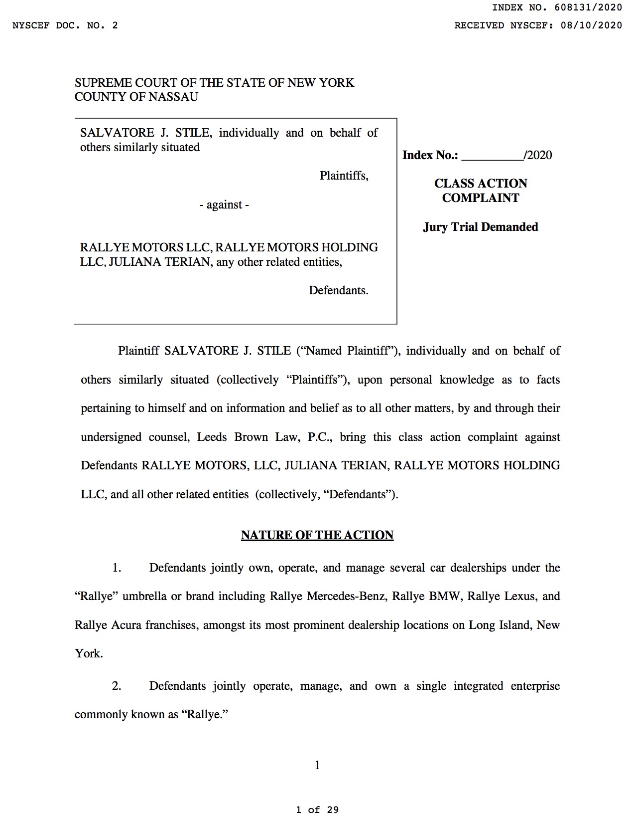 The suit (Index No. 608131/2020) was filed Aug. 10 in State Supreme Court in Mineola on behalf of North Shore resident Salvatore J. Stile, an international shipping executive who said he has been a Rallye customer for decades. The suit names Rallye Motors Co., Rallye Motors Holding LLC and owner, Juliana Terian, as defendants.