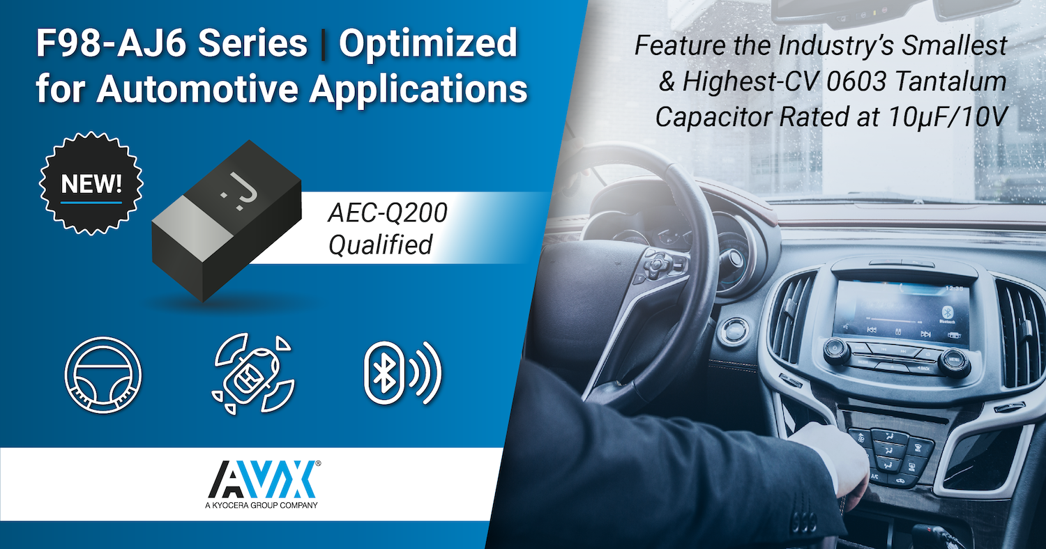 For more information about AVX’s new automotive-qualified F98-AJ6 Series miniature, high-CV resin-molded, surface-mount tantalum chip capacitors, please visit http://www.avx.com/products/tantalum/smd-tantalum-mno2/f98-aj6-series/. To order or learn more, contact our distribution partners Digi-Key, Mouser, or Newark. For all other inquiries, please visit www.avx.com, email inquiry@avx.com, follow them on LinkedIn, Twitter, and Instagram, like them on Facebook, call 864-967-2150, or write to One AVX Boulevard, Fountain Inn, S.C. 29644.