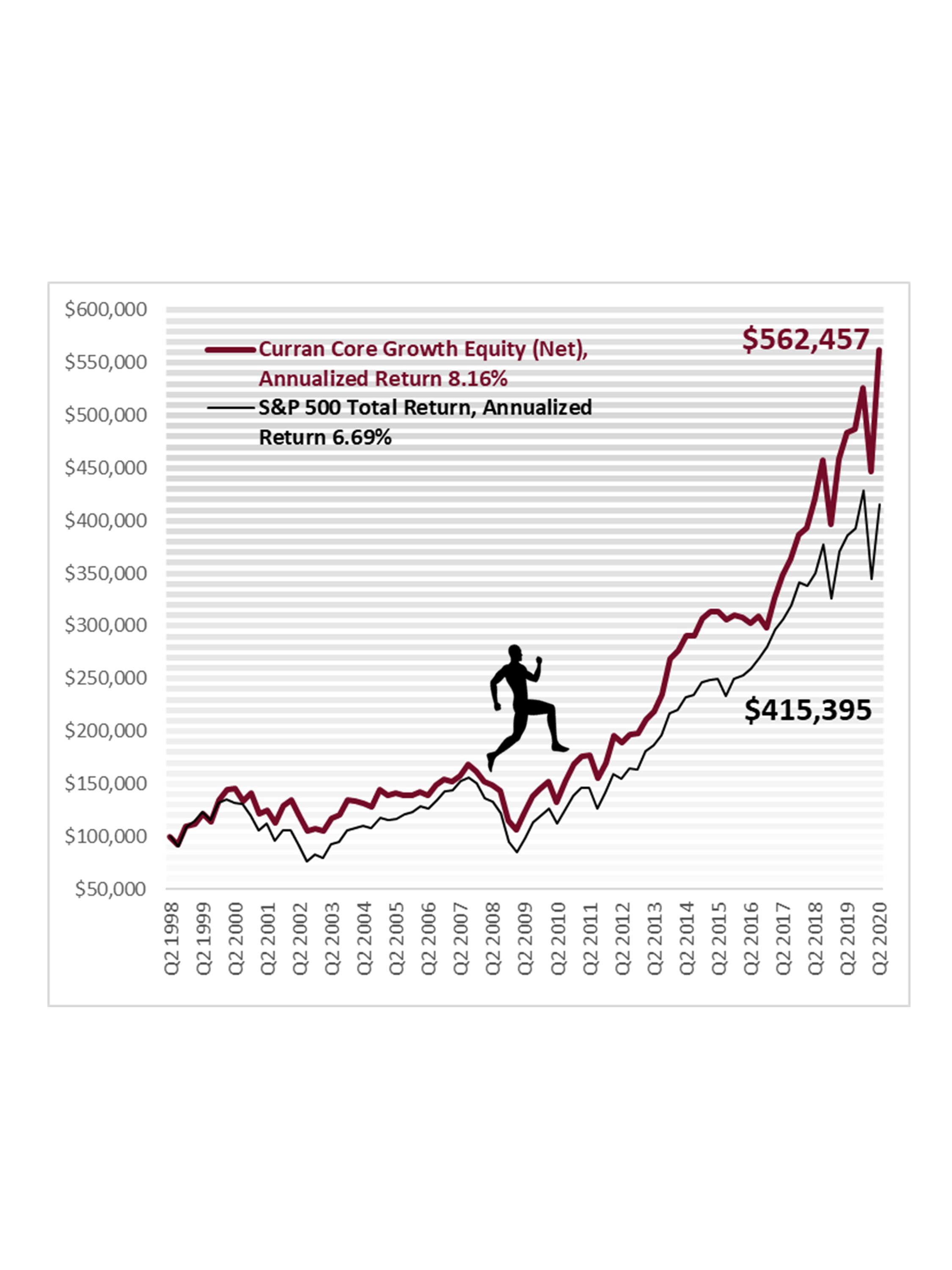 To achieve a coveted Bull & Bear Masters recognition in Large Core Equity Universe and US Core Universe, managers must outperform their benchmark during periods of up markets and decline less than the benchmark during periods of down markets. Over its history, Curran Core Growth Equity has been recognized as a top strategy among its peers numerous times by PSN Top Guns.