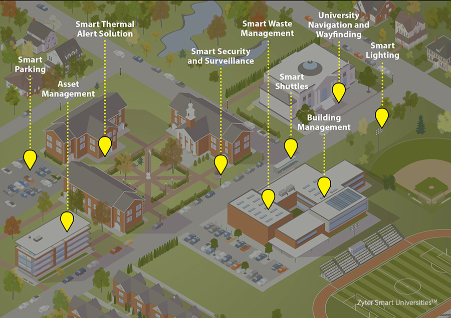 - Smart University and Connected Campus – Zyter Smart Universities helps higher education providers create a connected campus experience with embedded smart technologies and sensors for facilities and utility management, surveillance and security with video analytics, campus navigation, on-campus transportation, smart parking, and more. As a result, campus administrators can maximize resource utilization, minimize waste, and lower operational and labor costs. Additionally, Zyter SmartSpaces™ delivers a consistent stream of data from all connected technologies to drive better analytical insights into both student behavior and campus operations.