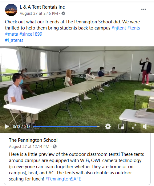 L&A Tents is one company, local to the Trenton, NJ area, that has been helping in every way they can during the pandemic. From provides testing tents to now classroom tents - they’ve been striving to help the community press forward this year. They have provided tents for hospitals, restaurants, colleges, and schools alike. A quick glance at their social media can prove just how many in the community L&A Tents has helped.