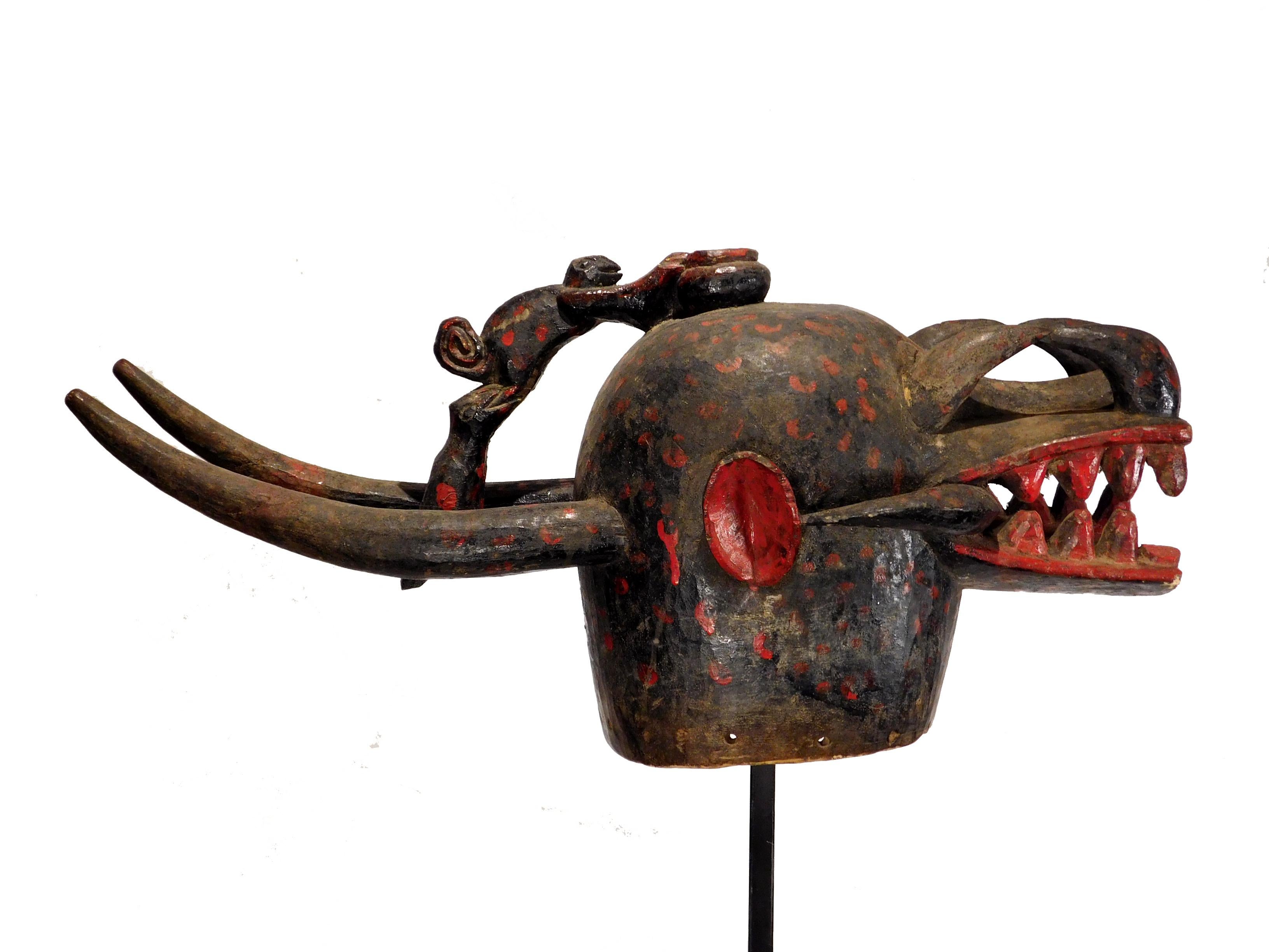 Lot 1: Senufo Kulonugo fire spitter, a massive wood carving covered with black paint and adorned by additions of red paint. Atop the head is a carved offering bowl (est. $2,500-$5,000).