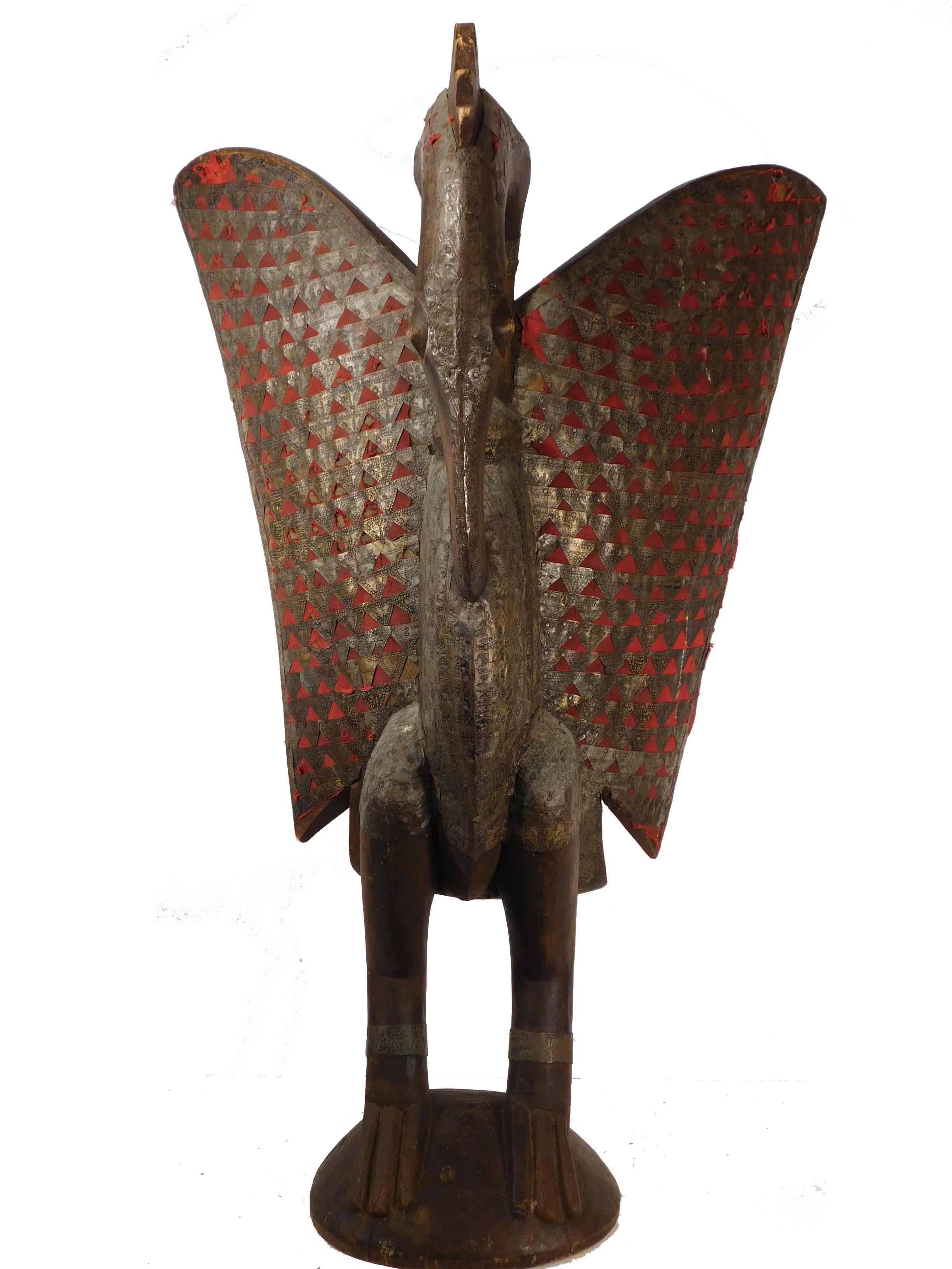 Hornbill with brass and cloth from the Senufo People of the Ivory Coast, Hand-carved from a solid piece of wood and decorated with red fabric, 43 ½ inches tall (est. $5,000-$10,000).