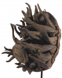 The war mask from the We/Guere people of the Ivory Coast (Lot 19) gave the impression of being both weightless and heavy on the video. “Its cluster of pointed, curling animal horns are seemingly writhing outward from the rough-hewn mask’s thick carved wood block,” Wood remarked. The mask, fashioned from wild animal horns and cloth over carved wood, with a heavy patina from libations, is 15 inches tall and carries an estimate of $1,500-$3,000.