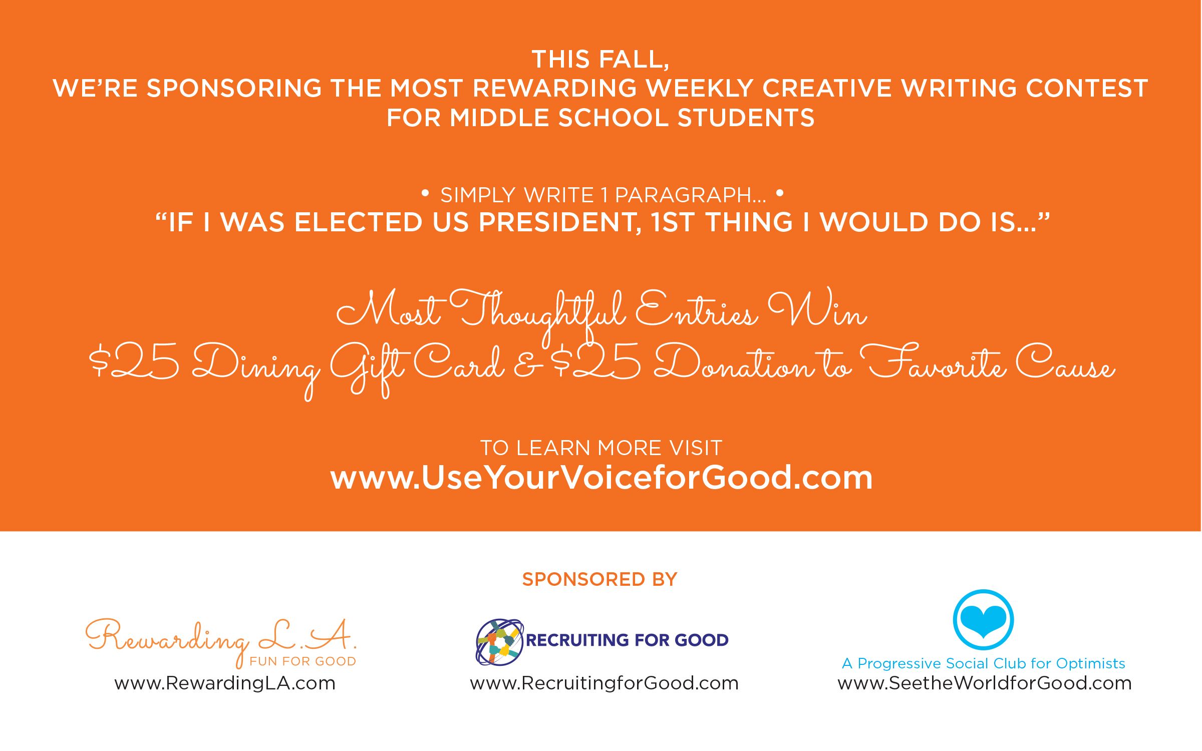 According to Recruiting for Good, Founder, Carlos Cymerman, "We love to listen and learn...what do kids care about most? Creative writing is a great way to express yourself, learn positive values; and use your voice for good."