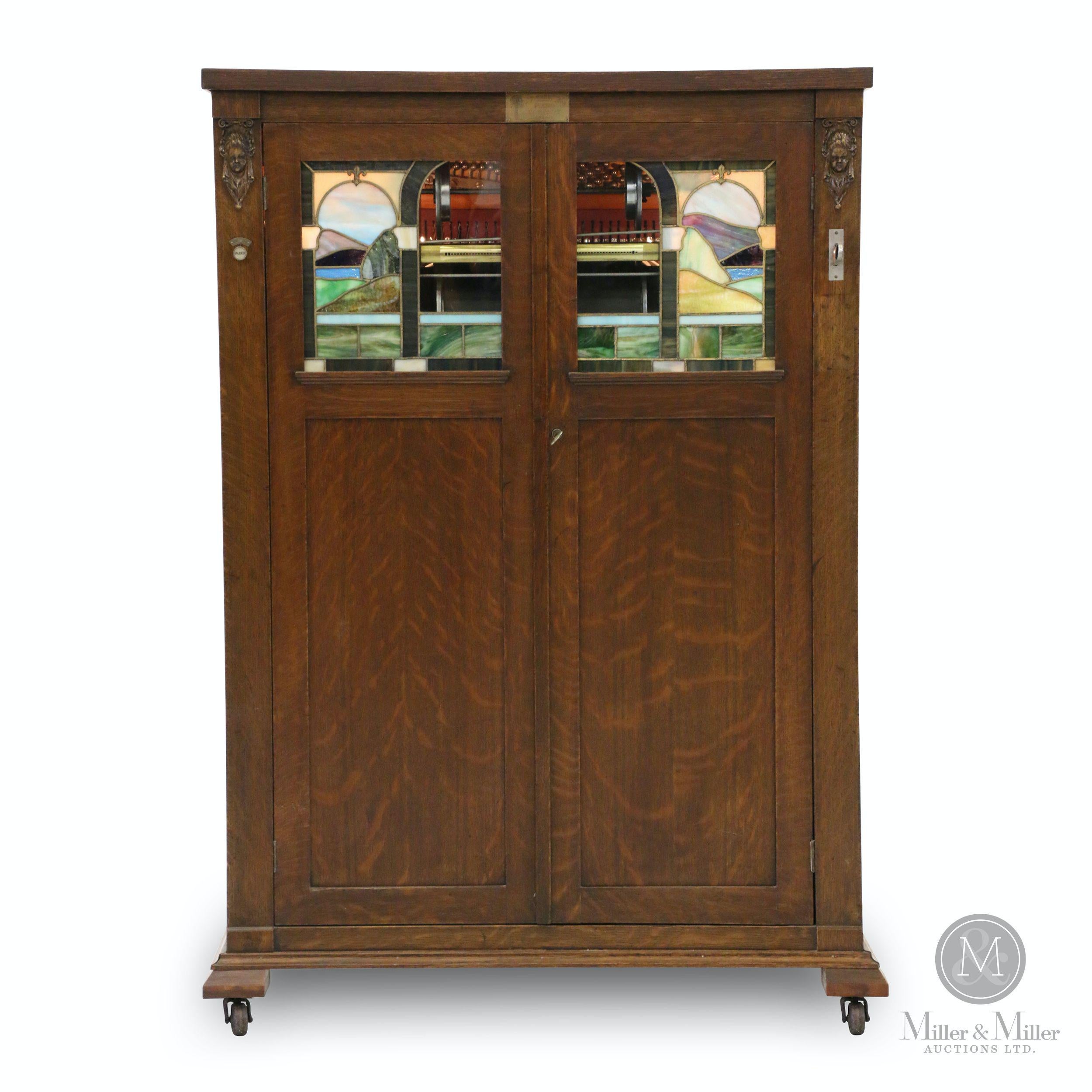Early 1900s Seeburg Style “G” orchestrion, a coin-op mechanical masterpiece, 66 inches tall by 79 inches wide, with mosaic leaded art glass doors, comes with13 “G” rolls (CA$24,780).