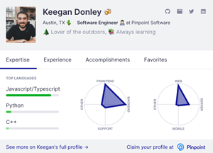 "The Pinpoint Profile allows developers to showcase their interests and accomplishments both within the software community and beyond. The best part is that it’s portable, so it can be embedded anywhere, following you from job to job and updating as your skills evolve," says Keegan Donley, Software Engineer at Pinpoint.