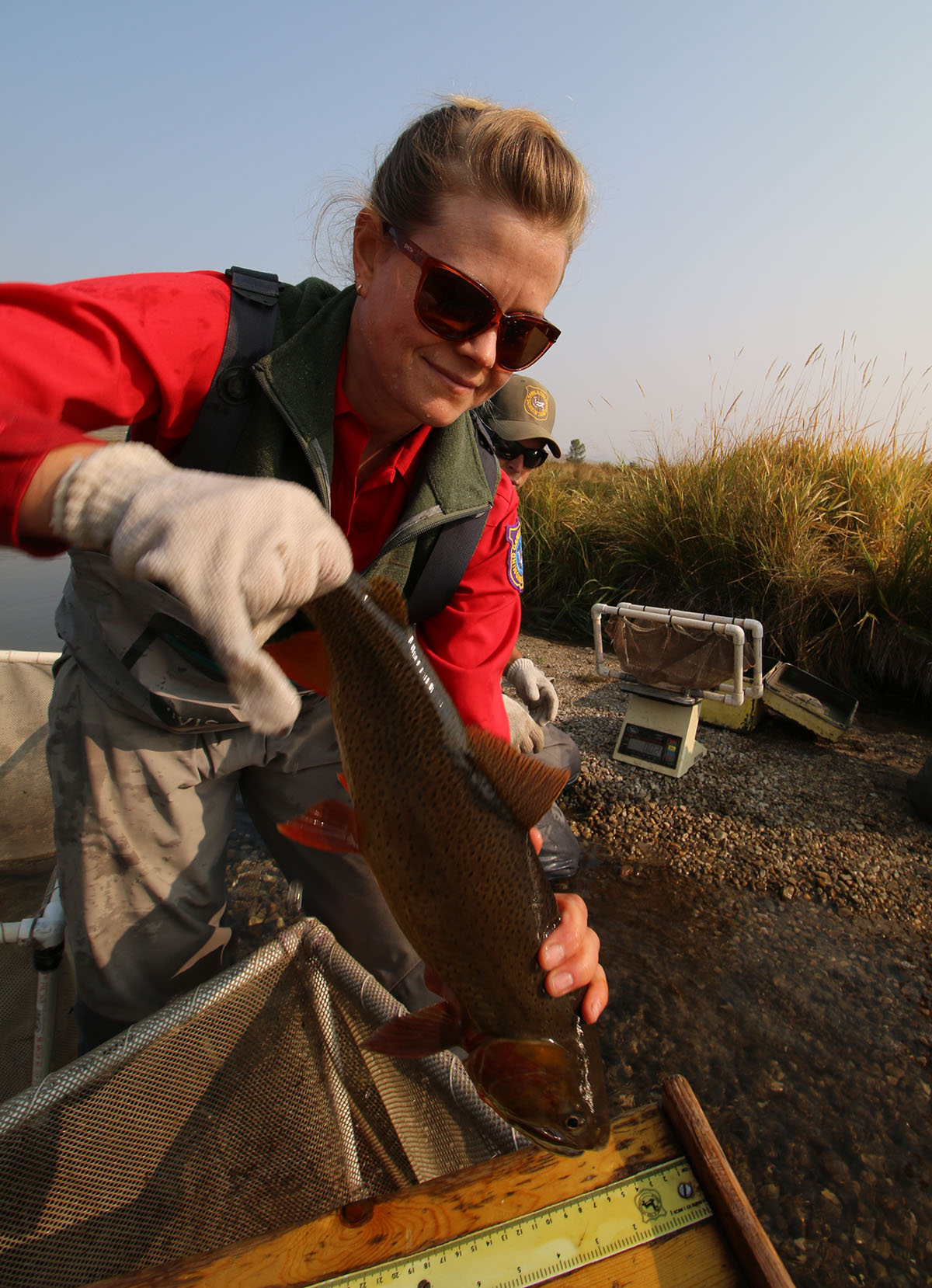 Jackson Aquatic Invasive Species Coordinator Chris Wight nets a nice cutty from Flat Creek on the National Elk Refuge.