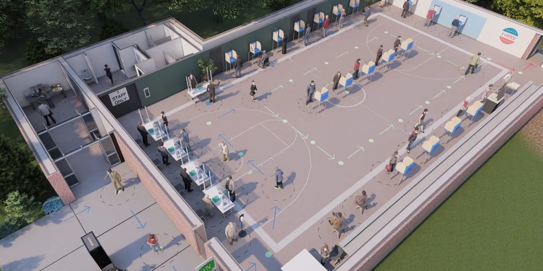 Developed in an effort to protect voters and polling place workers on Election Day, the resource provides architectural, engineering, operational and administrative strategies that election administrators and polling place workers can employ—as well as modify—for polling places and voting centers. 3D illustrations—produced by Corgan—provide concrete examples for how the strategies can be implemented and laid out in spaces large and small.