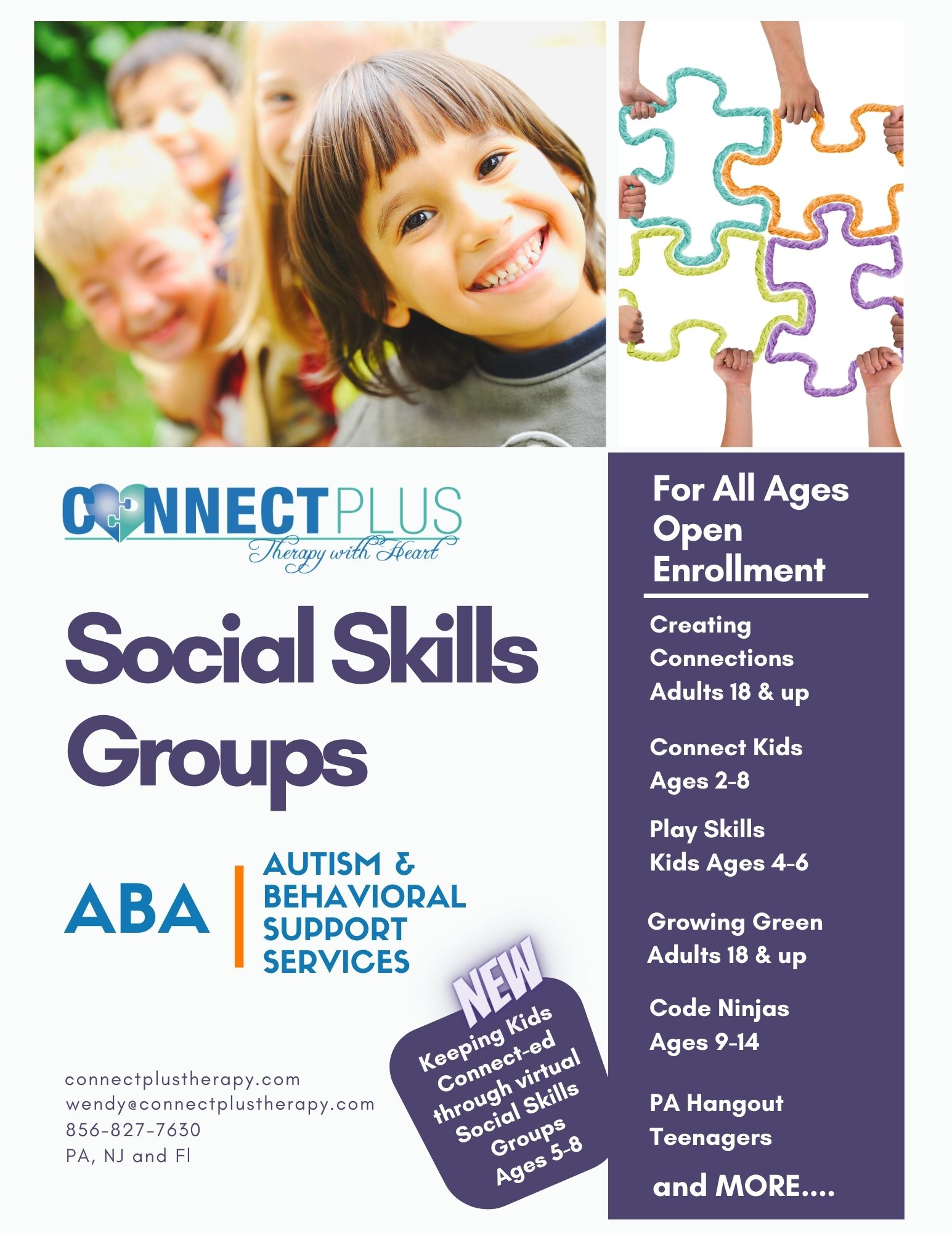 Connect Plus Therapy is “therapy with heart”, providing high quality 1:1 ABA therapy services in home, community and center based in NJ, PA, FL more coming soon
