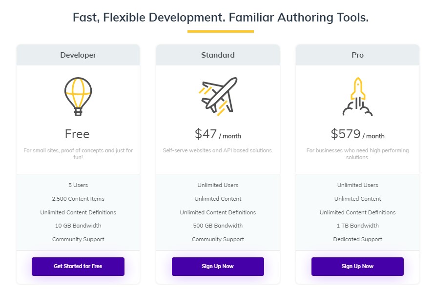 Standard Package: For only $47 per month, this package unlocks unlimited users, unlimited content types, and content items, allowing for exponential growth. Community support and 500GB of bandwidth is also included.