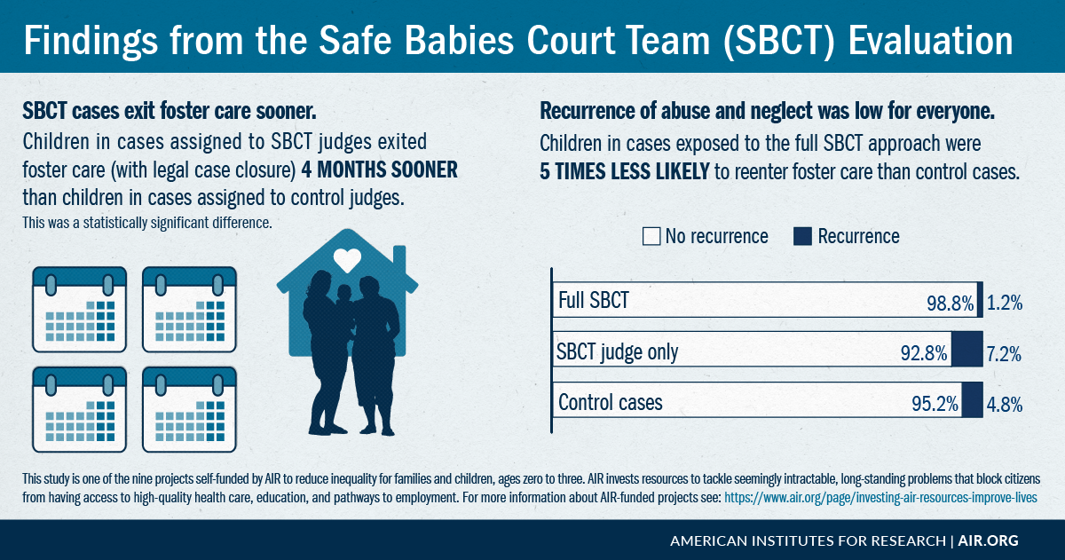 A new evaluation from the American Institutes for Research (AIR) provides evidence that using the Safe Babies approach can improve outcomes for children in foster care. The Safe Babies Court Team Evaluation: Changing the Trajectories of Children in Foster Care, funded and conducted by AIR, found that babies whose cases were randomly assigned to judges that used the Safe Babies Court Team approach exited foster care sooner than cases assigned to judges who were not trained in the approach (control judges).