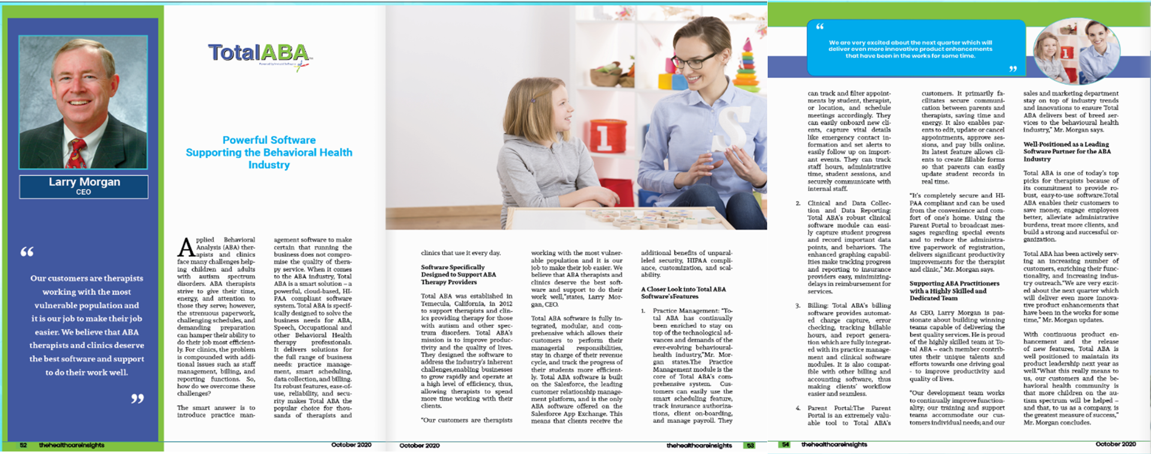 Total ABA, a leader in Behavioral Health software solutions, is recognized by Healthcare Insights Magazine, October 2020.