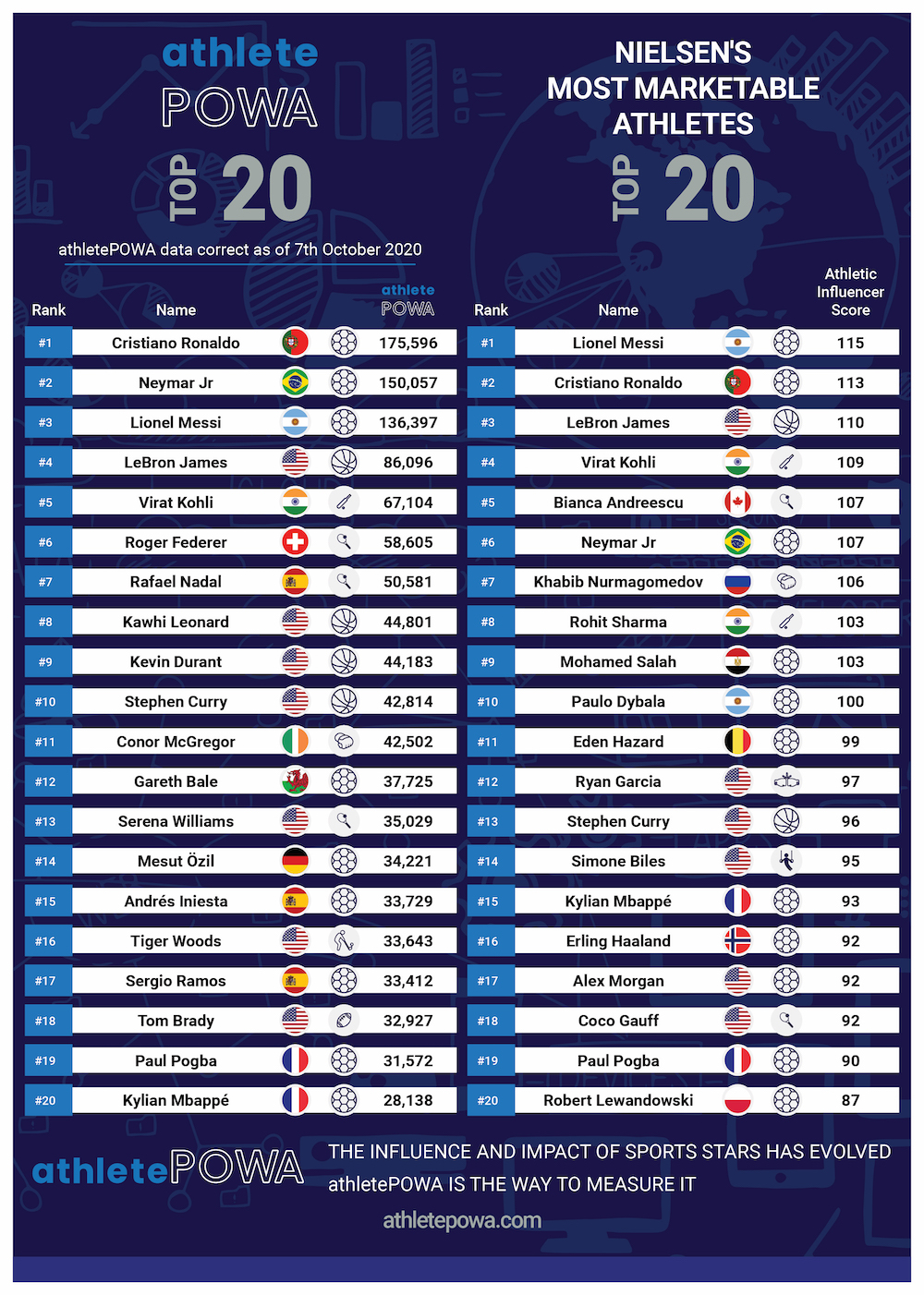 ● Of the athletePOWA top 20, eight also feature in the Nielsen list (Cristiano Ronaldo, Neymar Jr, Lionel Messi, LeBron James, Virat Kohli, Stephen Curry, Paul Pogba and Kylian Mbappe).