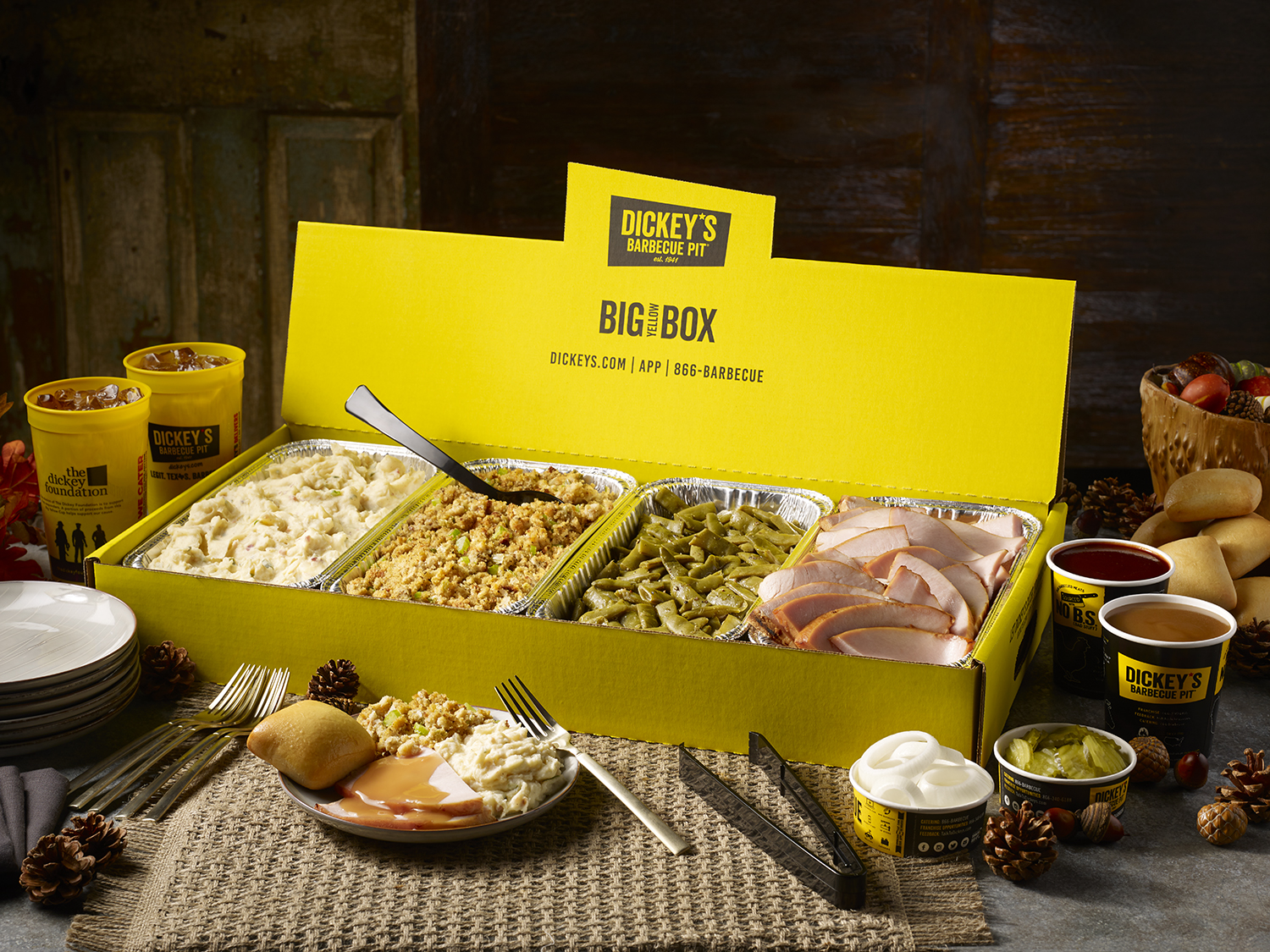 In addition, the barbecue joint with over 500 locations is introducing a new, convenient and ready-to-eat seasonal offering for guests to enjoy with their Holiday Party Pack Big Yellow Box featuring pit-smoked sliced Turkey, Baked Potato Casserole, Green Beans, Cornbread Dressing, Gravy, 12 Buttery Rolls, Pickles, Sliced Onions and Dickey’s Original Barbecue Sauce.