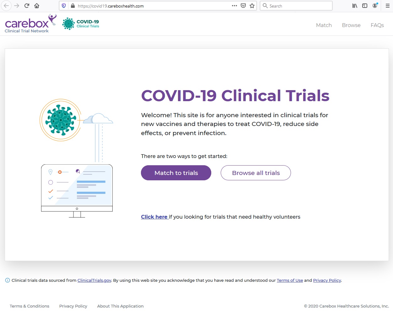 More information about the COVID-19 Clinical Trials website including answers to Frequently Asked Questions can be found at https://careboxhealth.com/covid19, or by writing to hello@careboxhealth.com.