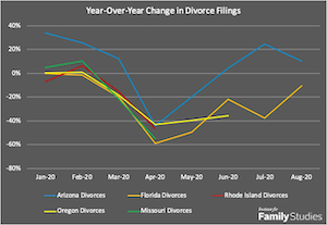 2. State divorce trends appear to be down in 2020. In the states where we have year-to-date data, there's been a marked decline in divorce during the COVID months. For example, divorce is down 19% in Florida, 9% in Missouri, 12% in Oregon, and 13% in Rhode Island. Only in Arizona has divorce increased, and that increase began in 2019.
