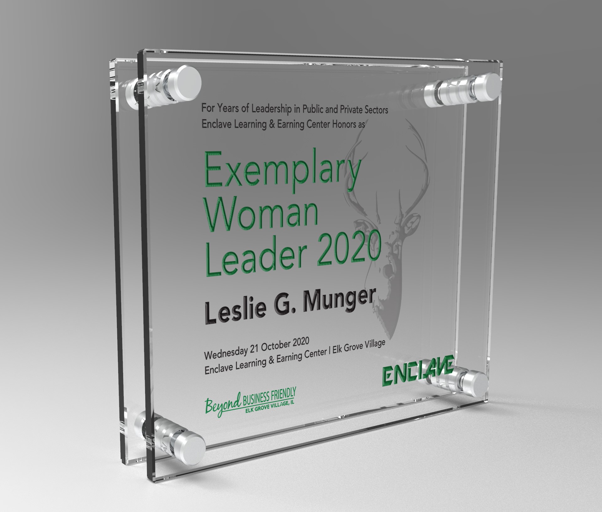 Leslie G. Munger, former IL Comptroller and Deputy Governor, was not only the first speaker selected for the new masterclass series, but also she was recognized by Enclave, in collaboration with Elk Grove Village, as Exemplary Woman Leader 2020, an annual Award of distinction.