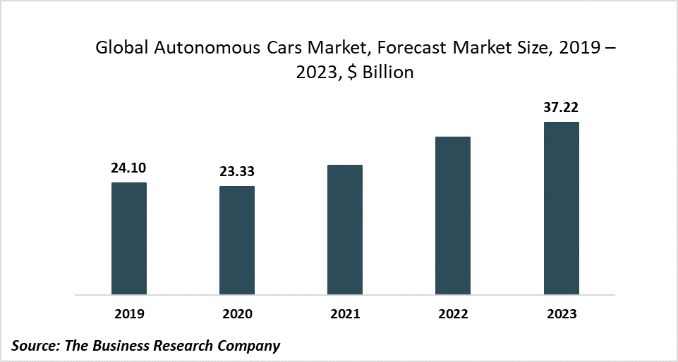 LONDON, GREATER LONDON, UK, October 30, 2020 /EINPresswire.com/ -- The global autonomous cars market is expected decline from $24.10 billion in 2019 and to $23.33 billion in 2020 at a compound annual growth rate (CAGR) of -3.19%. The decline is mainly due to economic slowdown across countries owing to the COVID-19 outbreak and the measures to contain it. The global autonomous vehicles market size is then expected to recover and reach $37.22 billion in 2023 at CAGR of 16.84%.