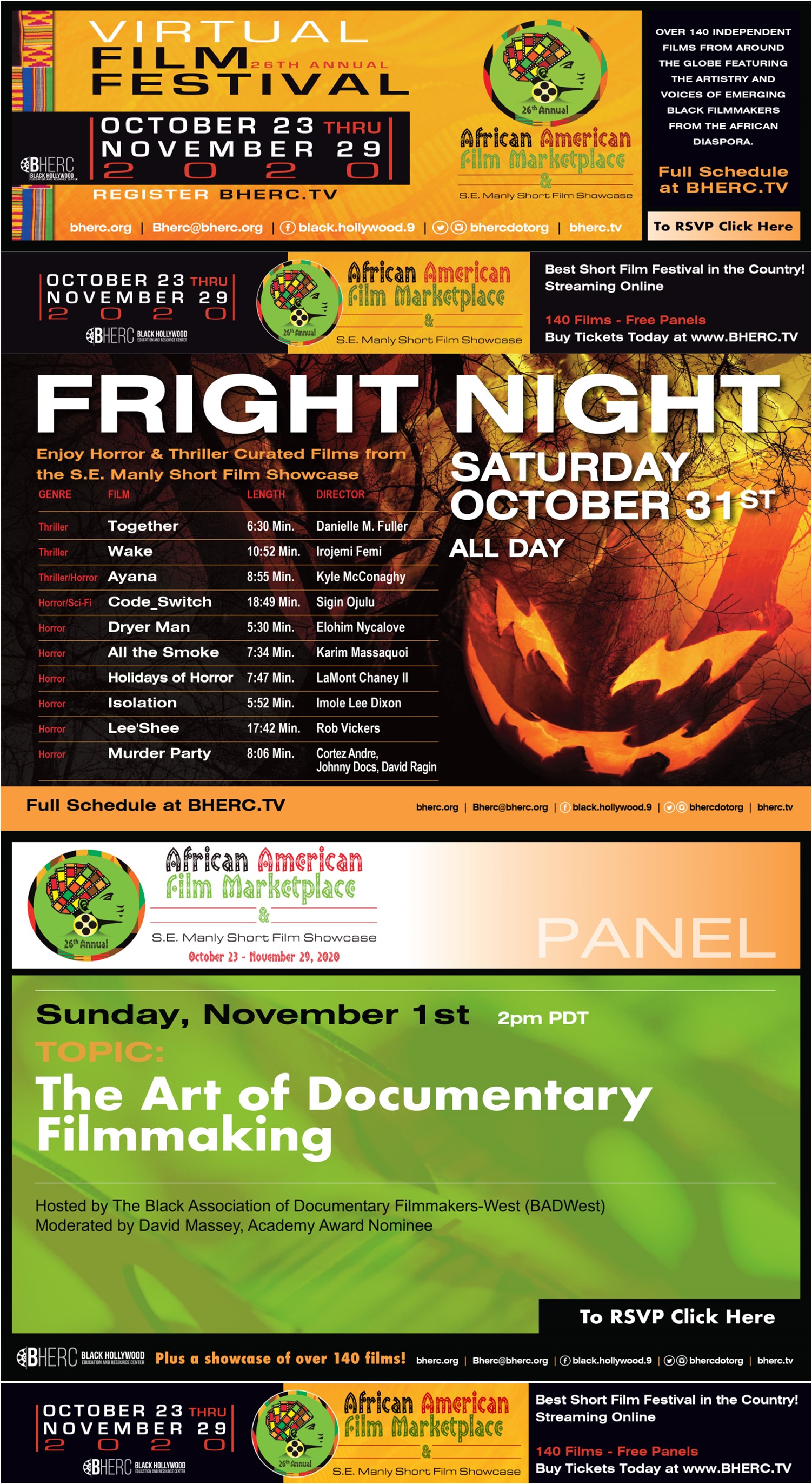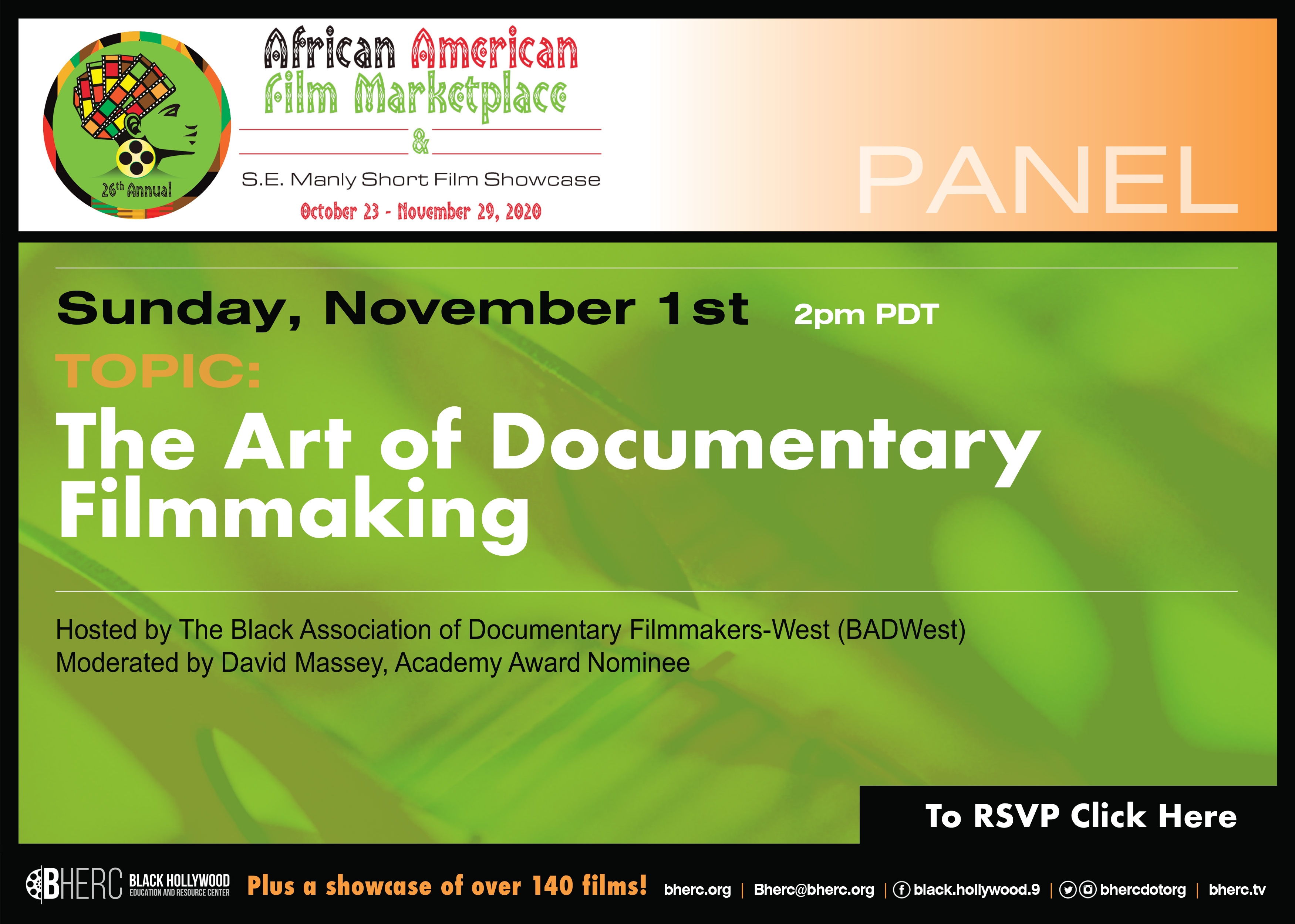 LOS ANGELES, CA, US, October 30, 2020 /EINPresswire.com/ -- (Hollywood, CA) – The Black Hollywood Education and Resource Center (BHERC) announced today that Academy Award-nominated filmmaker, David Massey "Last Breeze of Summer" will moderate the first of the 10 plus panels offered at the 26th Annual African American Film Marketplace & S.E. Manly Short Film Showcase (AAFM SEMSFS) airing online now through Sunday, November 29, 2020 on www.BHERC.TV with more than 140 films from 18 countries and 20 US states. The panel hosted by the Association of Black Documentary Filmmakers West (www.badwest.org) will take place online Sunday, November 1, 2020 at 2:00PM (PDT). This event is free on a first come first served basis.