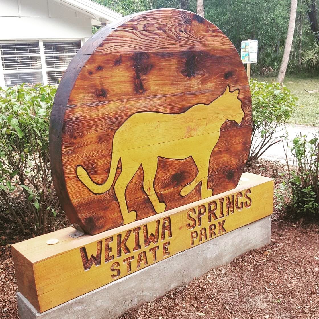 The five-foot-tall Florida panther sign stands in front of the ranger station just inside the park’s entrance and was sculpted by Deltona-based chainsaw carver Mark Rice. Mark has also created an eight-foot-tall carving of a Florida black bear but its location in the park has not yet been decided.