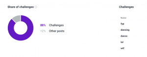 Almost 90% of their content is challenges with tags like fyp, dancing, dance, lol, or wtf.
