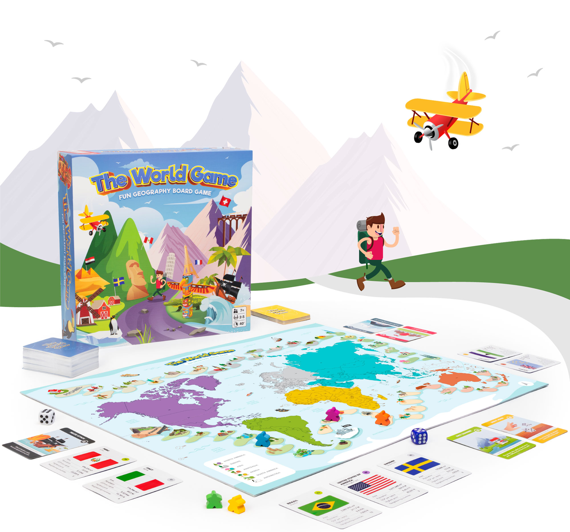 The World Game is a highly interactive educational geography game for 2-5 players. It incorporates dice and two sets of playing cards to move pawns on the map.