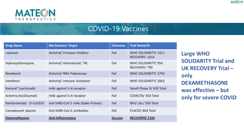The development of OT-101 is important given the failure of other drugs leaving dexamethasone as the only clinically proven effective drug against COVID-19.
