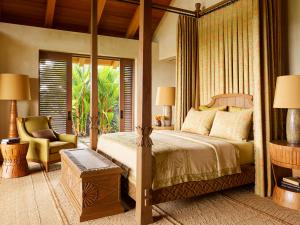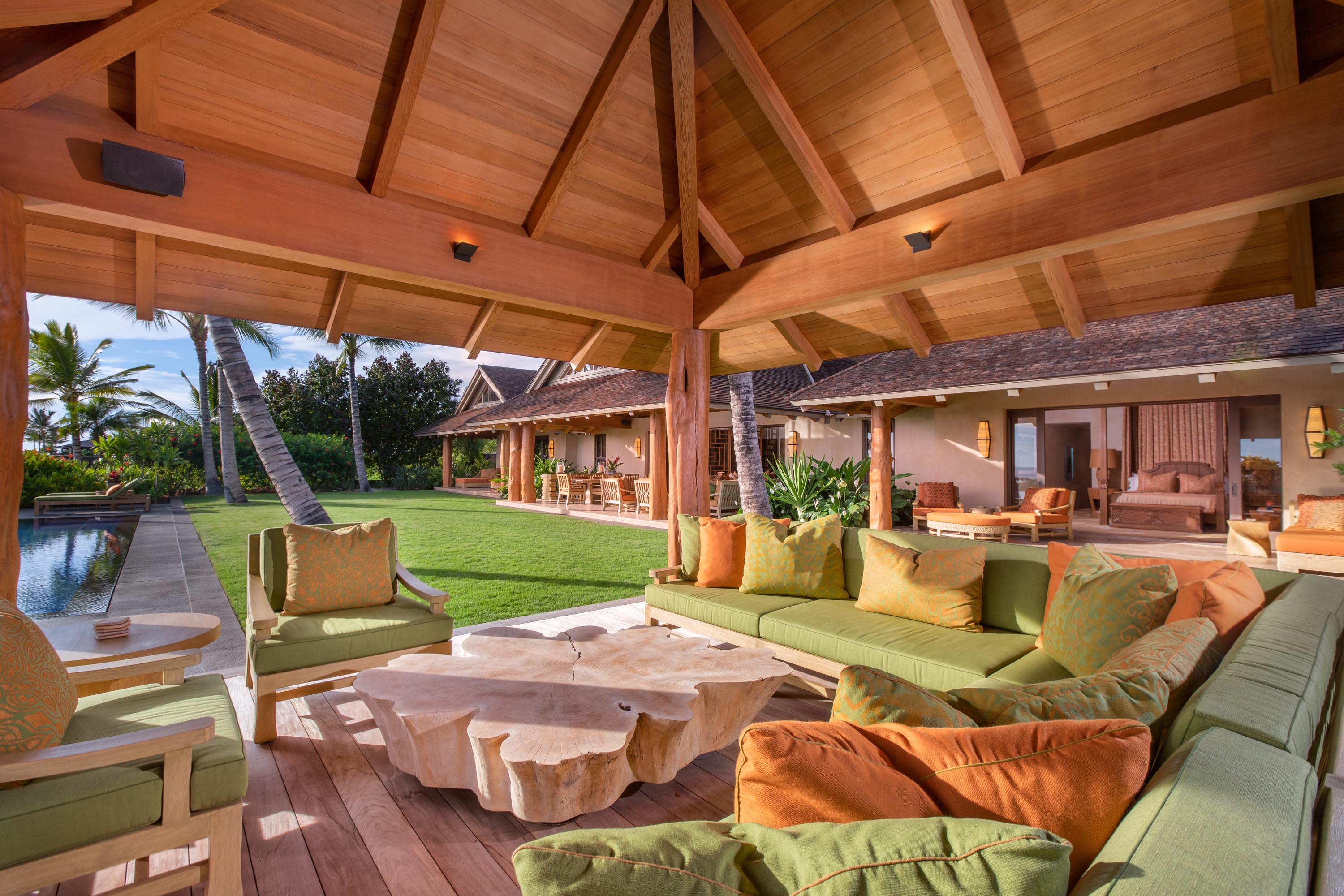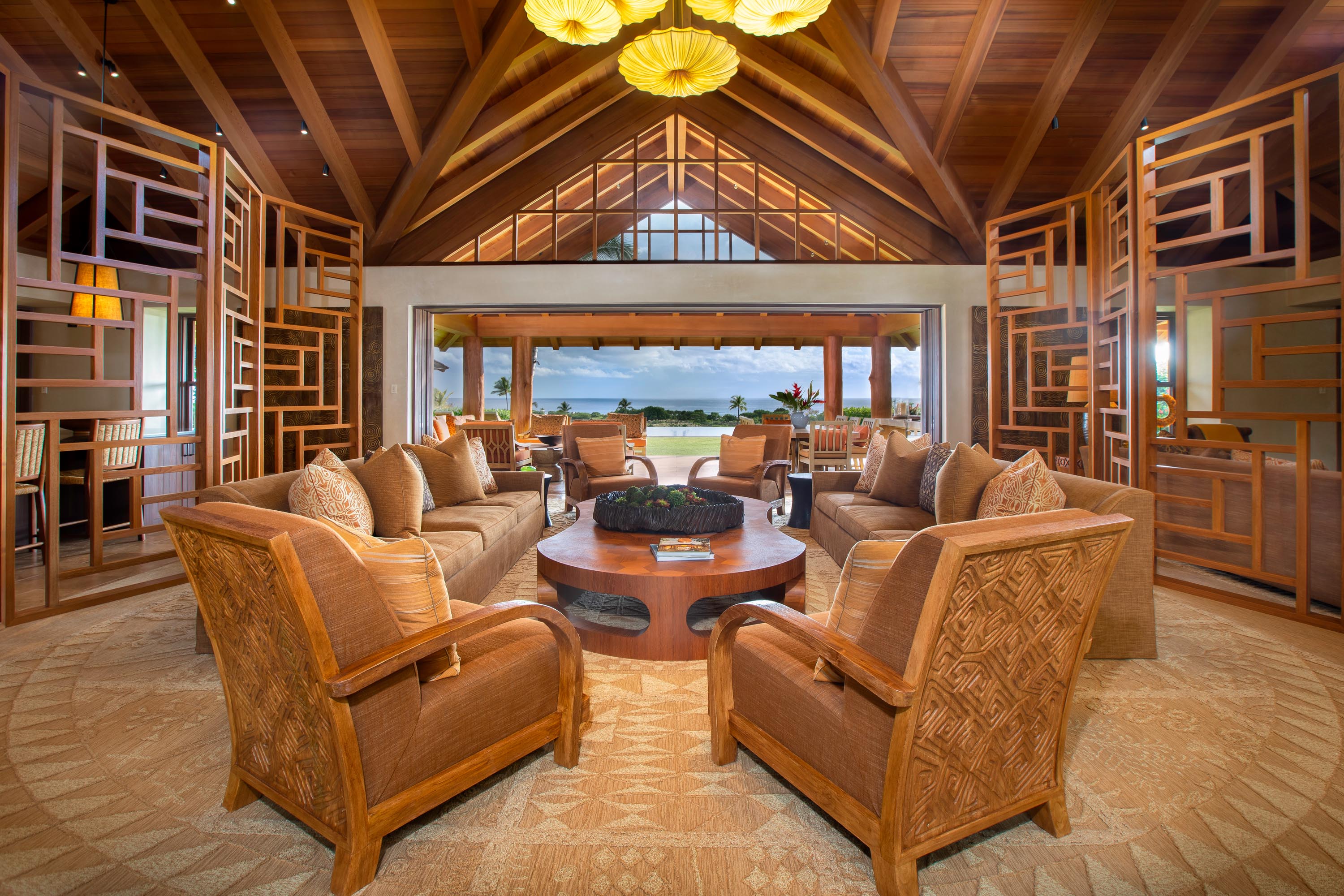 Perched on a prominent tier of land in the exclusive Kohanaiki, a private equity golf club and community, this one-acre estate offers commanding ocean views. Rich teak hardwoods grace the interior, from the beamed ceilings to custom cabinetry to artful screens that enable gentle trade winds to flow. This turnkey escape features bespoke furniture designed and crafted specifically for this villa by Douglas Durkin of Douglas Durkin Design in San Francisco. Known for their very customized approach to residential design, Durkin drew inspiration from traditional Kapa Cloths of the indigenous Hawaiian culture and the Tapa cloth patterns of Pacific cultures, combining the patterns and motifs into a one-of-a-kind collection of custom furnishings found throughout the residence. Surrounded by lush, tropical flora, the pocketed, sliding glass doors grant unobstructed access to a spectacular outdoor living space. Enjoy covered lanais that span 1,500-plus square feet, flow seamlessly from the great room to two serene master sanctuaries, and offer unimpeded views of the Kona coastline.